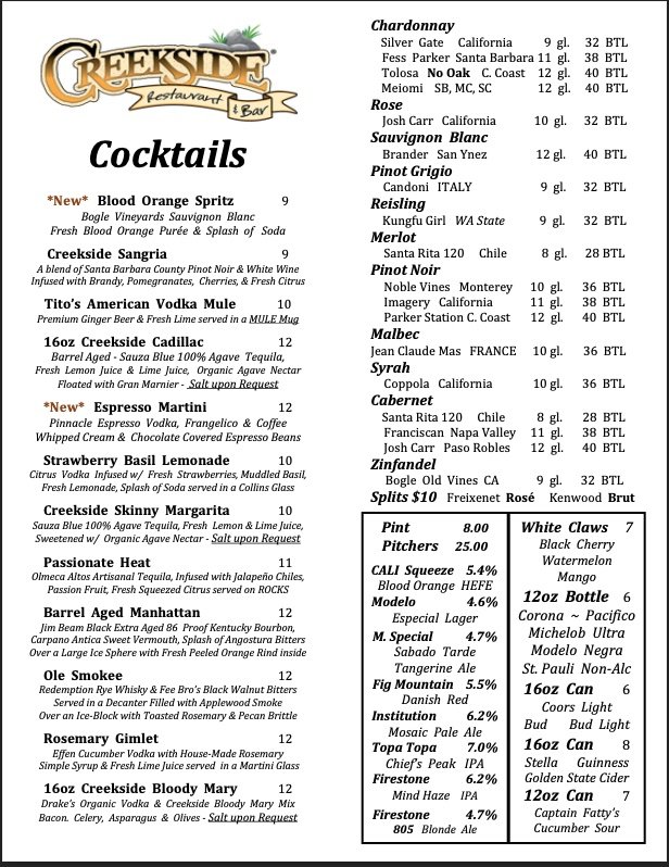Welcome to The Creekside Restaurant & Bar, where the heart of New American cuisine meets a vibrant atmosphere. Nestled in Santa Barbara, this destination is perfect for casual dining with family and friends. The menu boasts a rich variety of offerings, with standout items like the burnt ends and Creekside Burrito, celebrated for their flavor and generous portions.